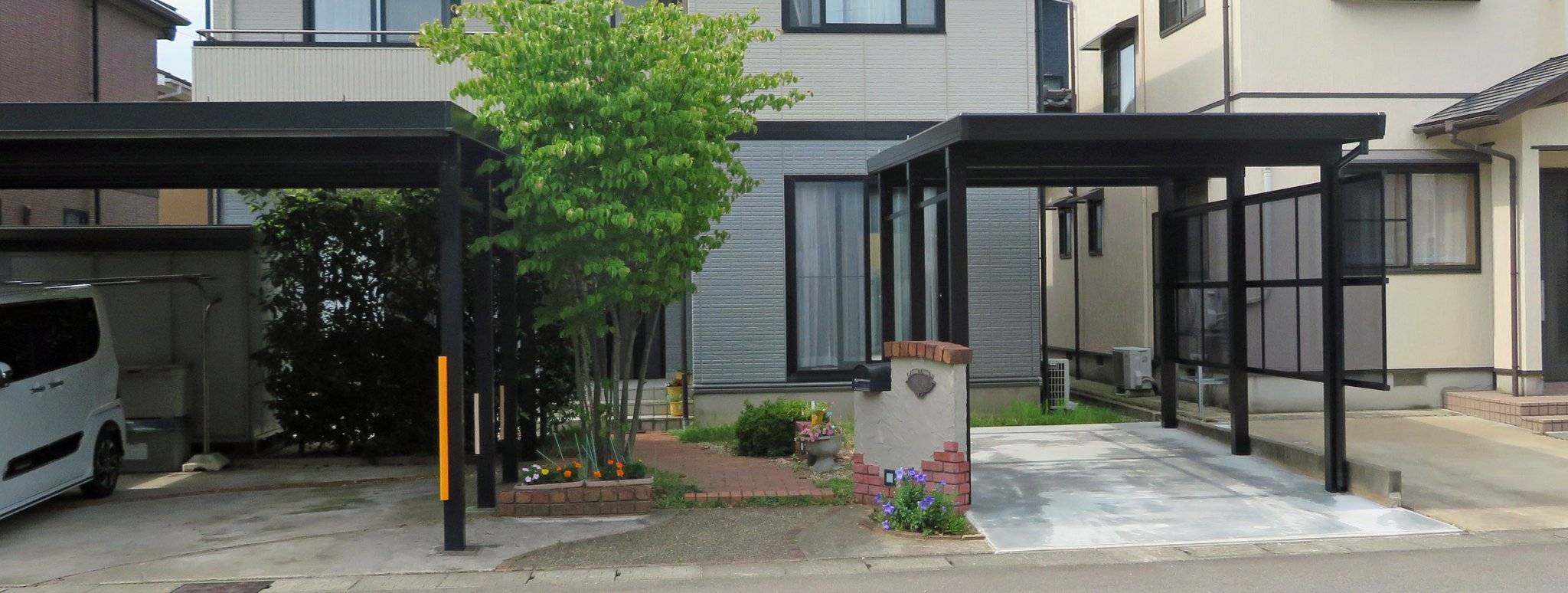 新築の現場です アルミカーポート2台用とイナバのガレージ1台用を作って頂きました。いろいろデザインして頂き満足しています