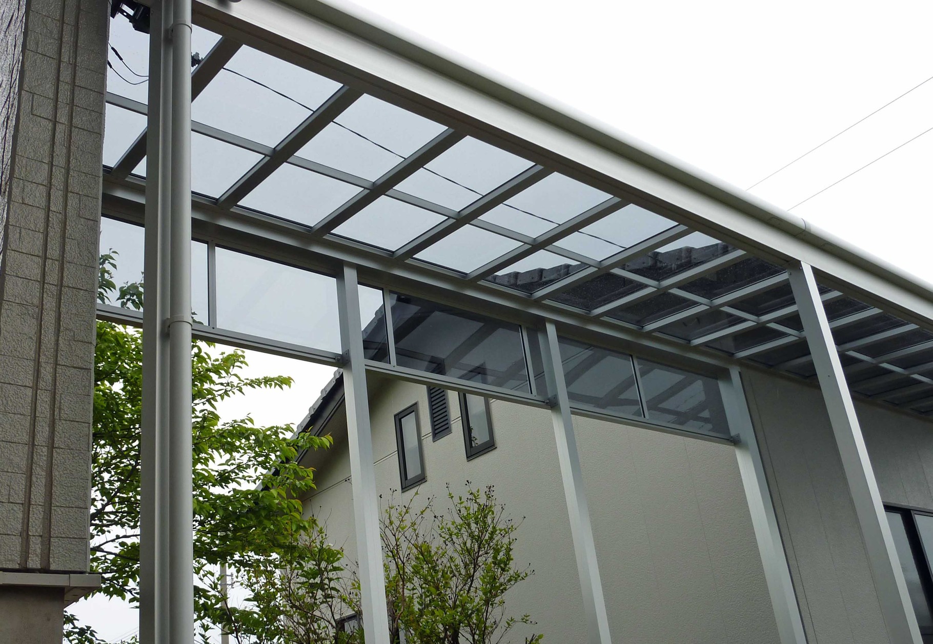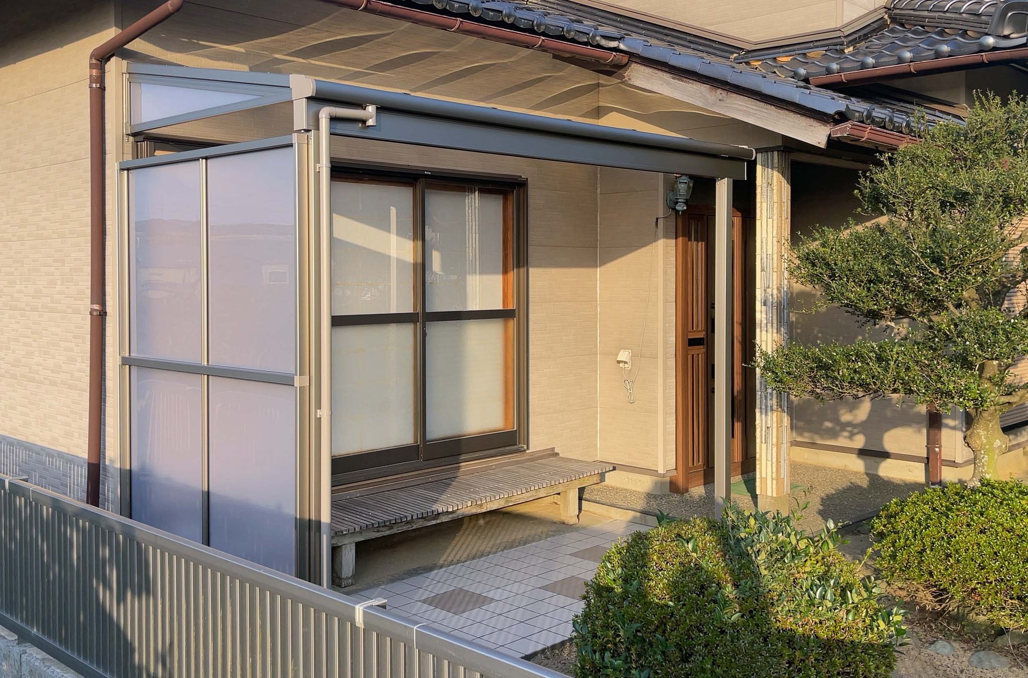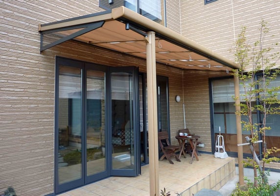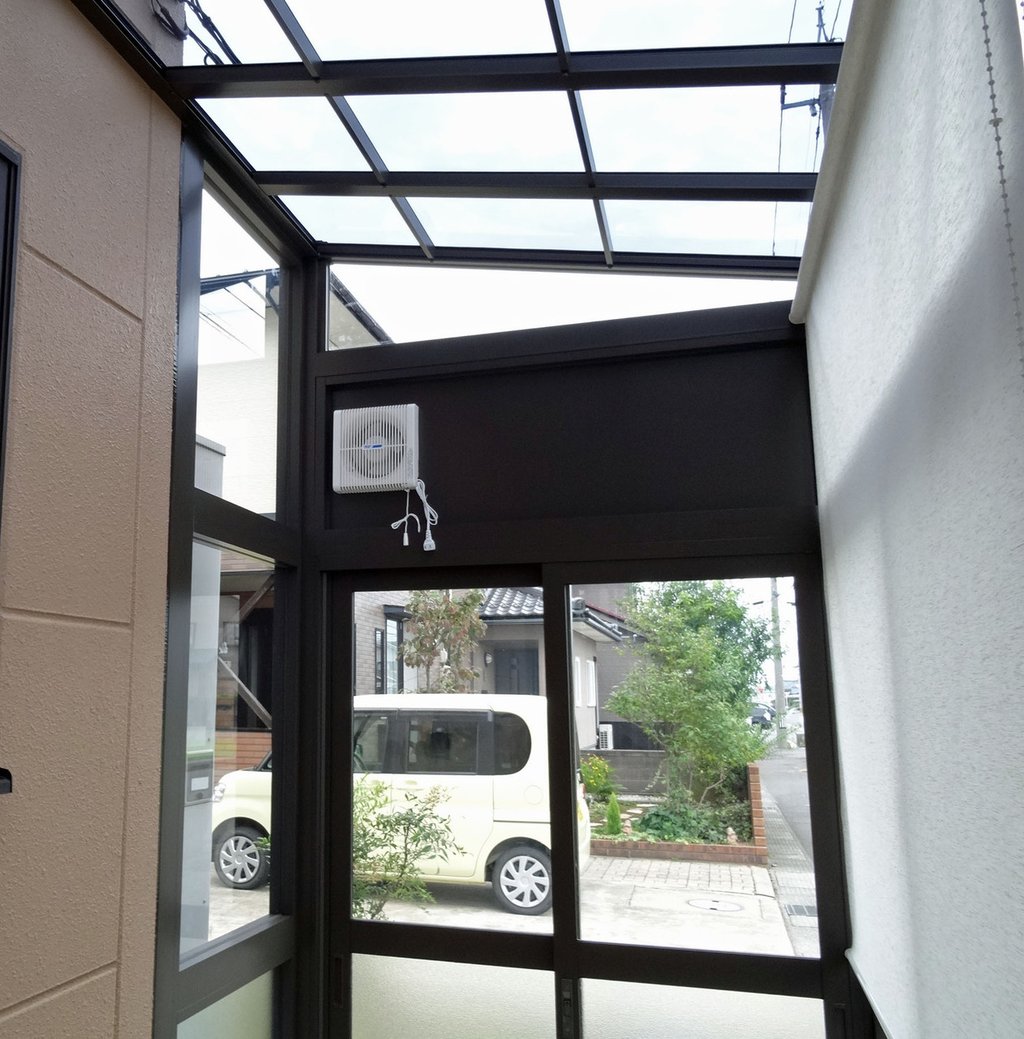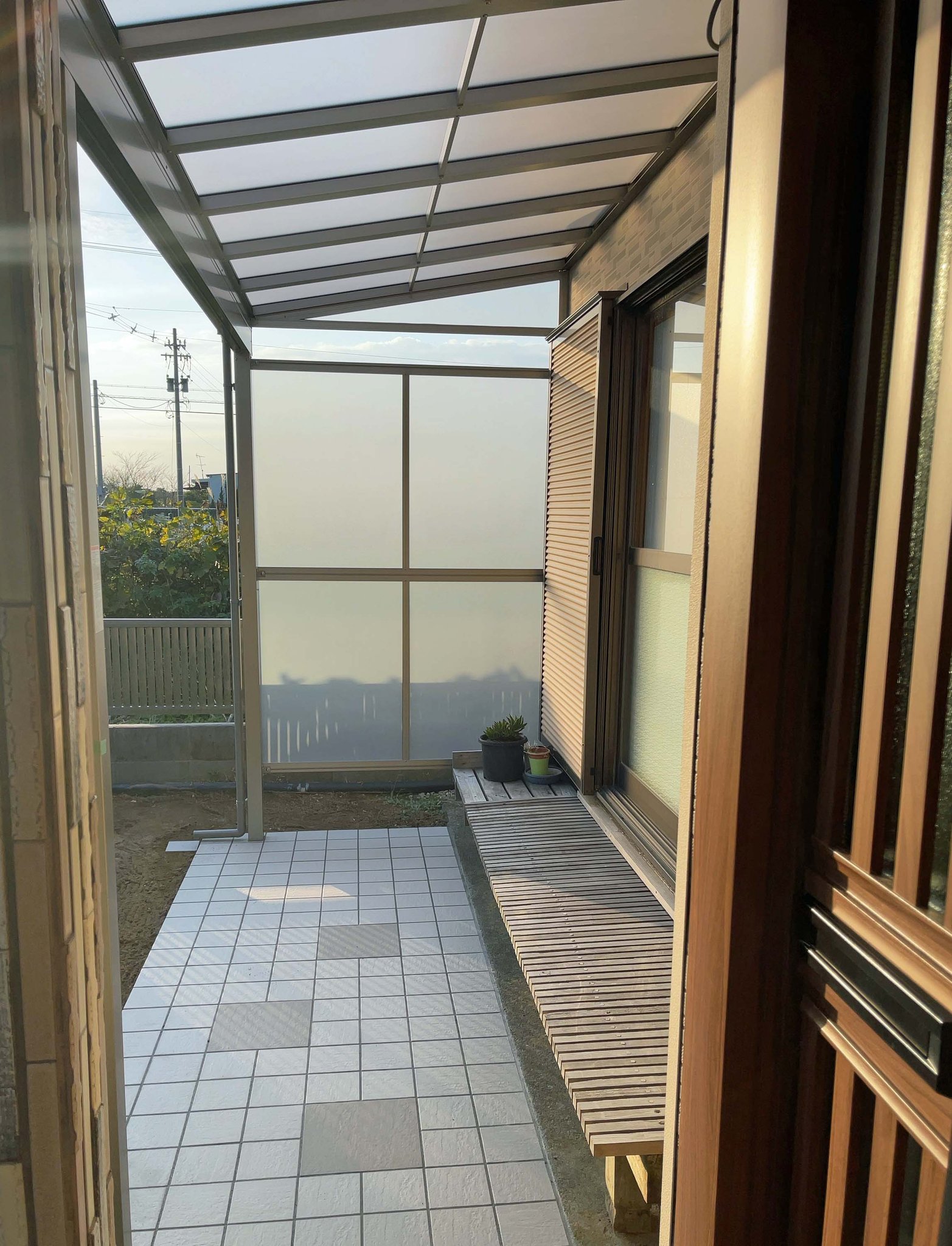 強風が吹く所なので 風に強いテラスVSという商品を付けてもらいました。横にもサイドパネルを付け風対策はばっちりです。