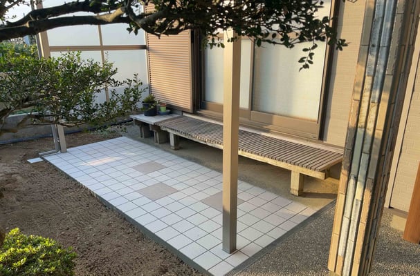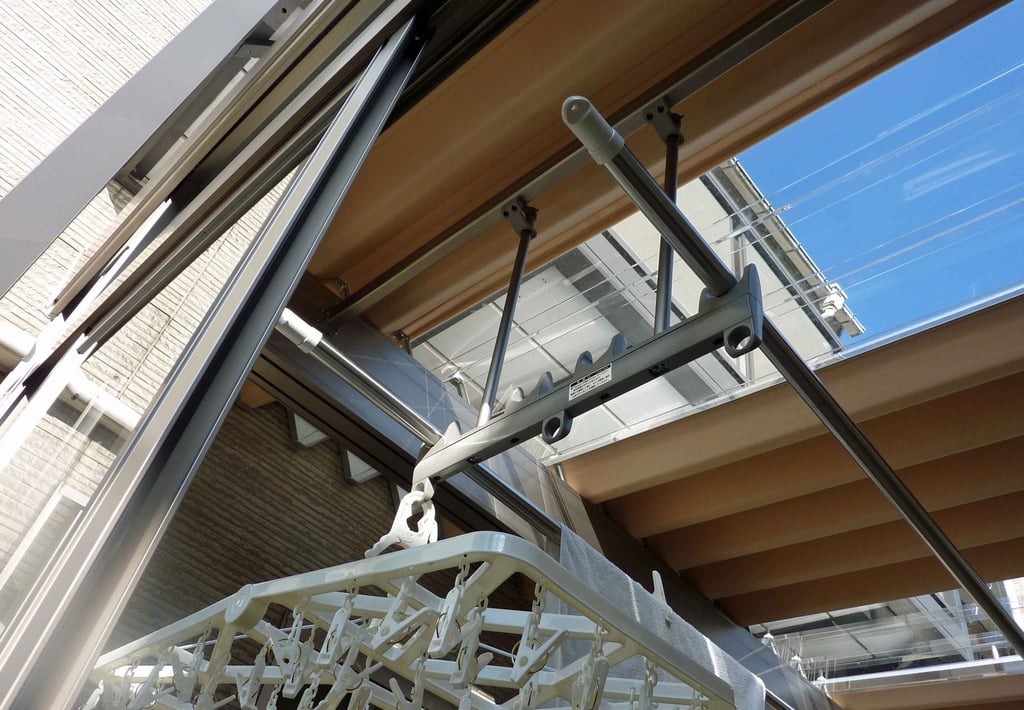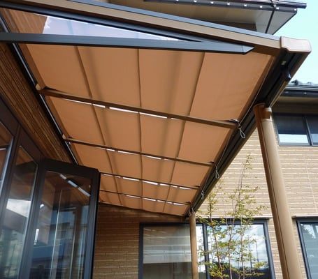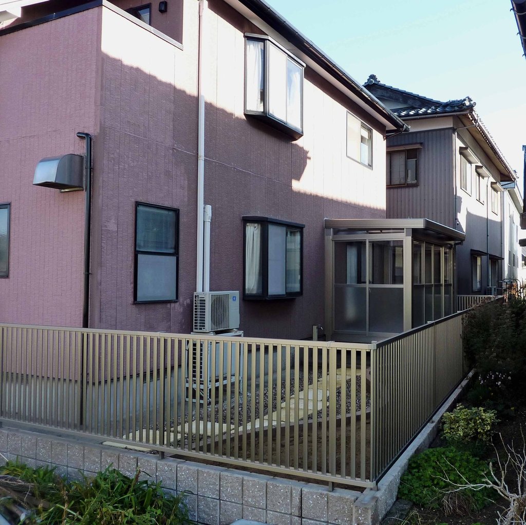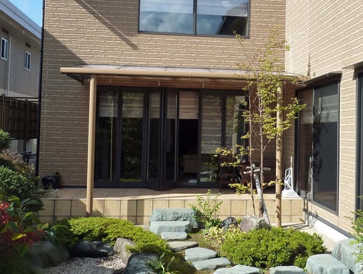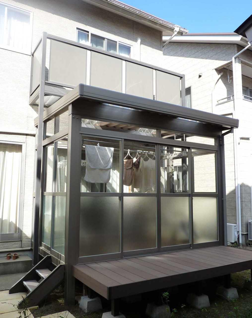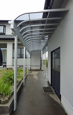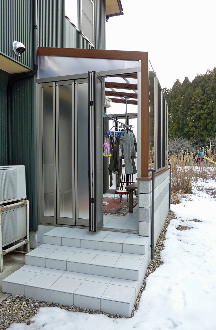 強風が吹く所なので 風に強いテラスVSという商品を付けてもらいました。横にもサイドパネルを付け風対策はばっちりです。